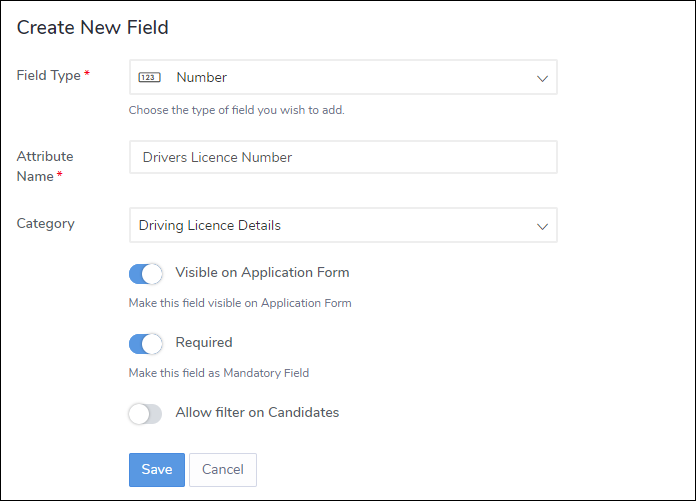 8. Note that some field types are provided with the sort option. You can set the Allow Filter on Candidates toggle to ON if you want to sort your candidate profiles on the said field