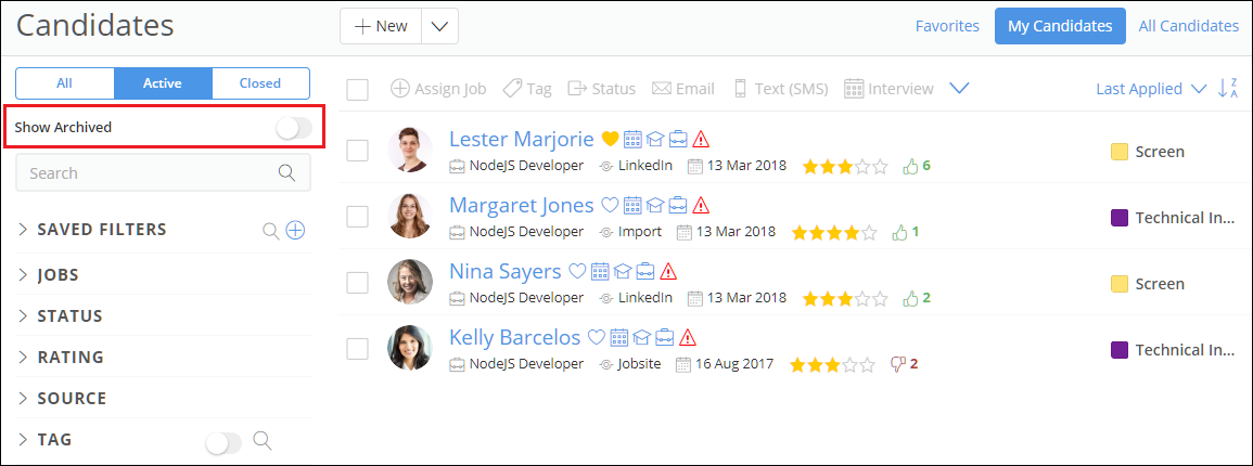 1. Toggle the 'Show Archived' switch on the Candidates List page to ON