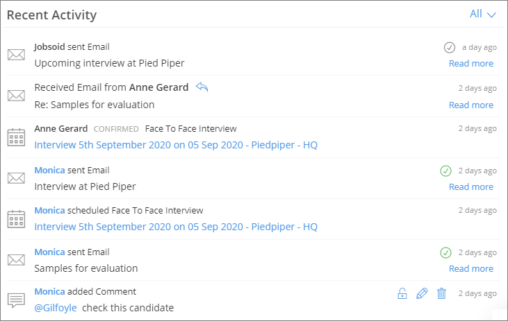 All the activities carried out between the candidate and the hiring managers is listed on the Recent Activity section on the candidate profile. The Recent Activity section is placed on the right side of the Candidate Profile. You can see the activities according to the order of the dates it occurred.