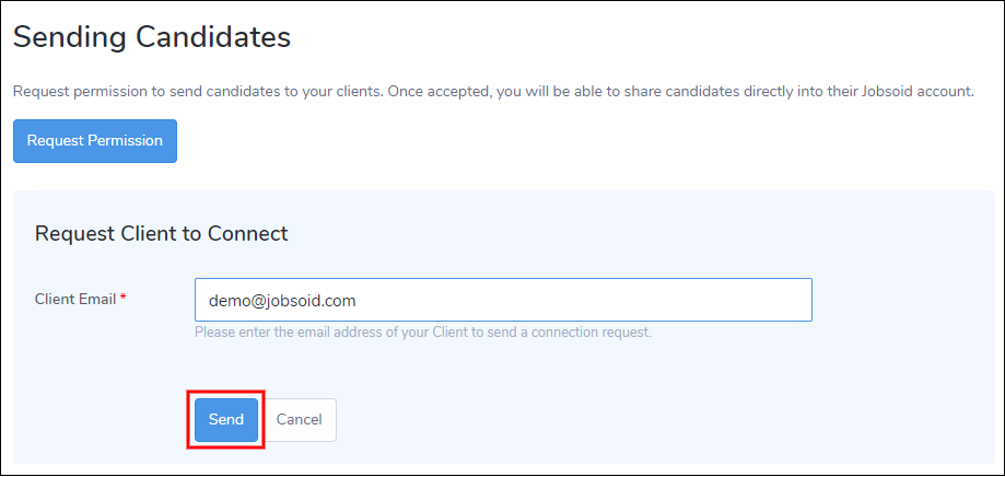 6. An email message will be sent to your client right away asking them to connect with you on Jobsoid. If your client is not a Jobsoid user, he can create a free account and get started with receiving candidates from you