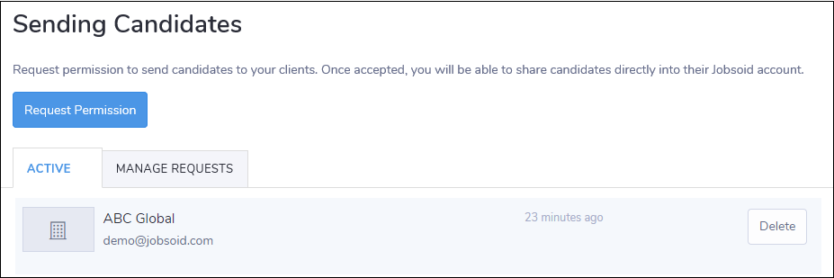 All the requests will be shown under the Manage Requests tab under Sending Candidates section. You can delete your request any time by clicking on Delete button.