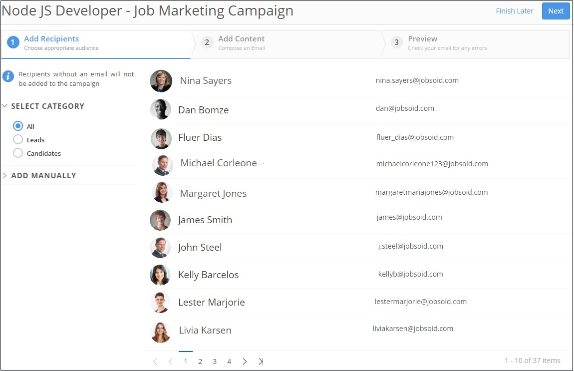 4. Choose the audience for your campaign. You can either select the entire leads list or candidate list or both at the same time. You can also manually select the leads and the candidates