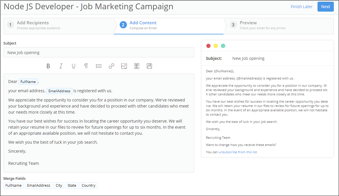 5. Click on the Next button once you are done adding the desired audience to your Recipients list. This will take you to Step 2, i.e., Add Content. Enter the subject of your message in the subject text box