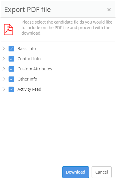 4. Select the fields that you would like to display in your PDF file in the Candidate PDF Options window