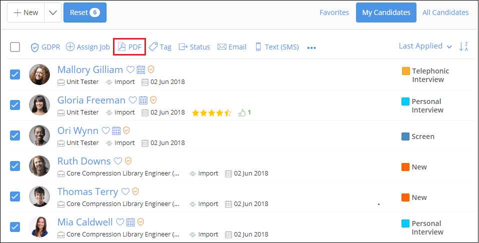 3. Click on PDF option on the Action bar which is present just above the candidate list