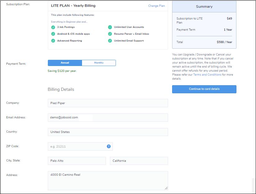 There may be times when you outgrow the capacity of your existing Plan and would need more Job openings. Upgrading your plan is a simple process with Jobsoid. Moreover, you will be charged a pro-rated amount for the Upgrade. Which means you will be charged for a difference between the cost of the New higher subscription and the unused time on your existing subscription.