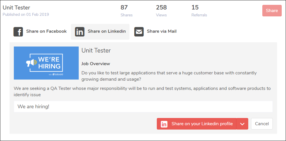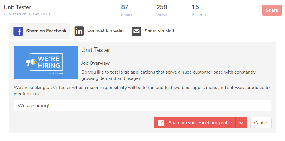 2. Talent In Cloud allows you to share your jobs on your Facebook profile, Facebook pages (if any), your LinkedIn profile, your Twitter profile, and via an email