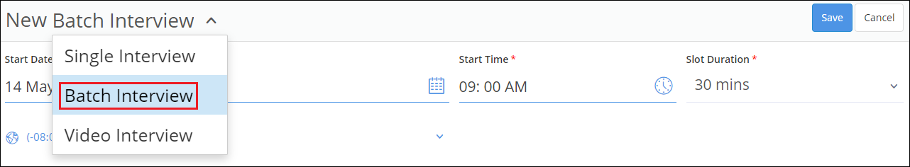 2. To schedule an interview for multiple candidates, select the Batch Interview option from the drop down