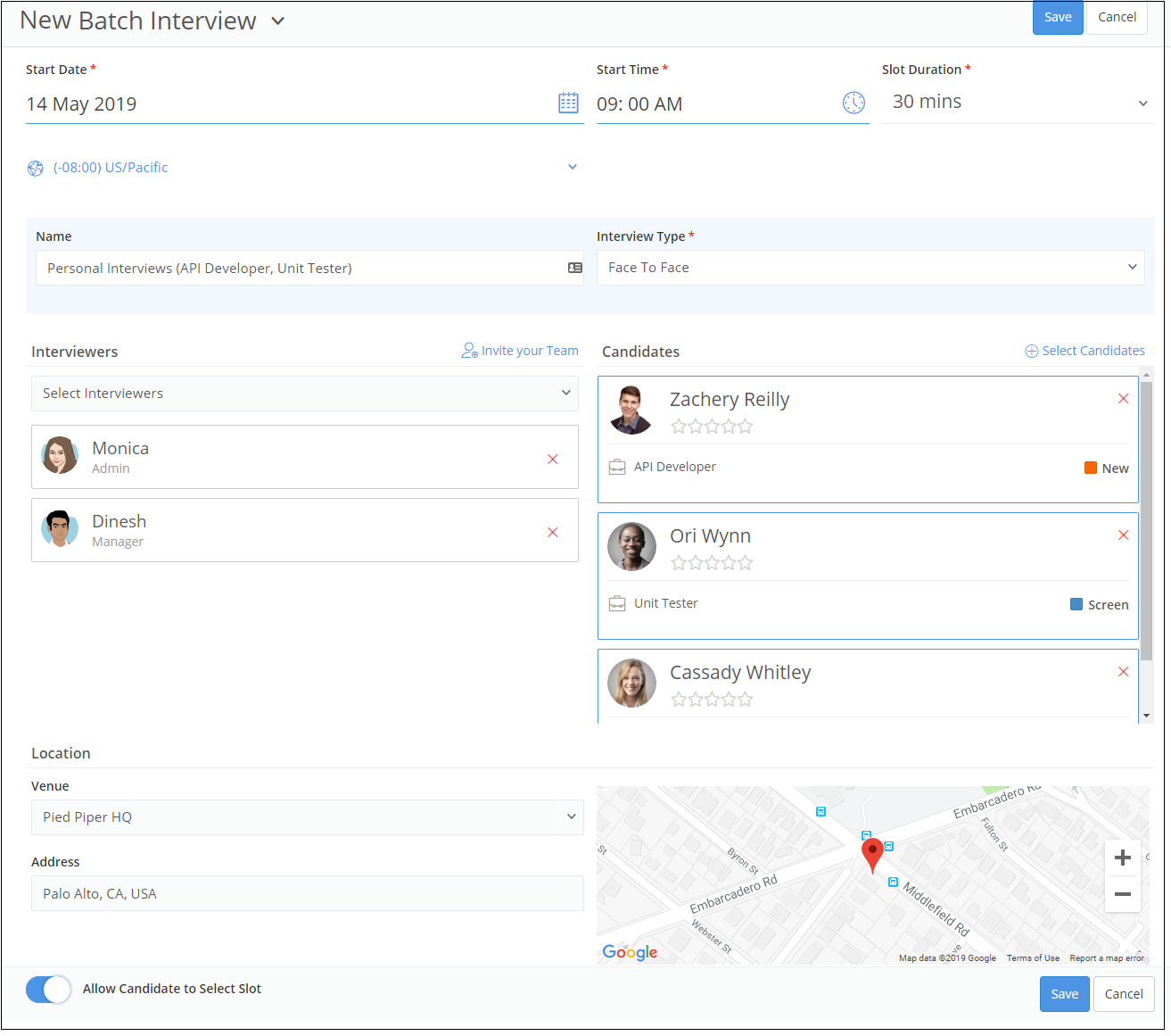 8. Ensure that ‘Allow Candidates to Select Slot’ toggle is switched ON if you want your candidates to choose the time for the interview. Save the interview by clicking on Save button