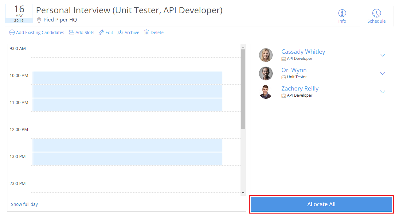 2. Click on Allocate All button if you wish to allocate the candidates to the available slots. Drag and drop the candidates to allocate them to specific time slots
